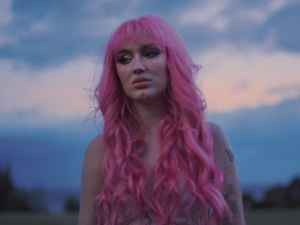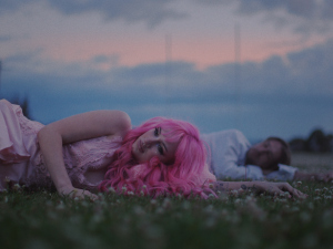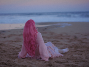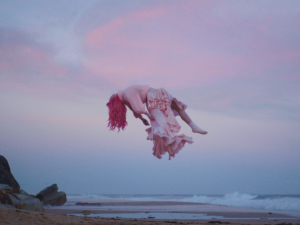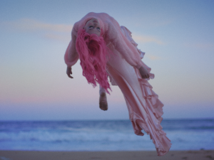 Peach sprints along a quiet beach at sunrise before levitating eerily above the sand